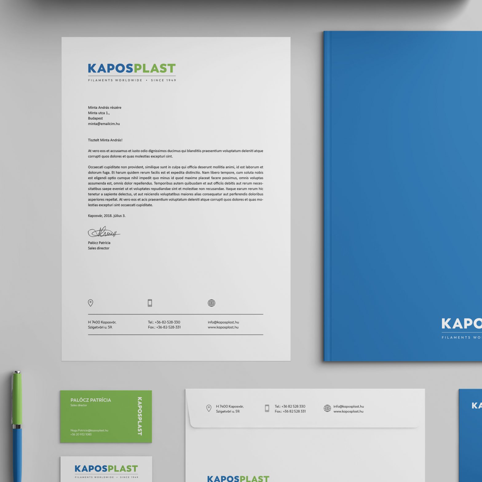 Az új design valóban nem szakad el a gyökerektől, hiszen a kék és zöld színeket megtartottuk, csupán frissítettük őket, így a megjelenés a korábbinál üdébbnek hat. A levélpapírra és névjegykártyákra új betűtípus került, az egyedi termék minta katalógusban pedig nem csupán megnézhetjük, hanem meg is érinthetjük a KAPOSPLAST széles kínálatát.